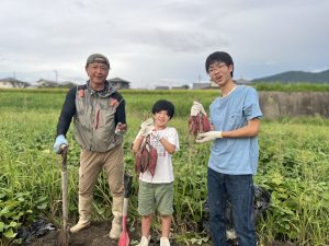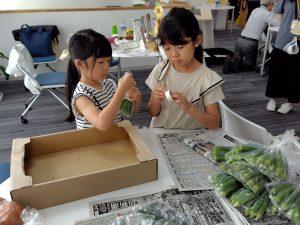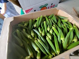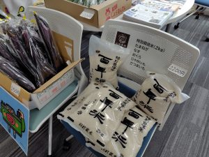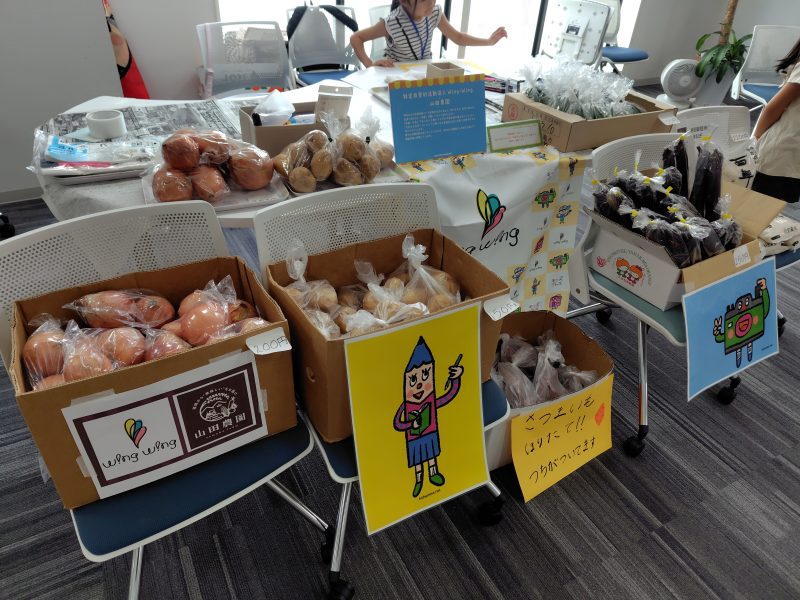 福岡市西区の山田農園さんにご協力いただき、たまねぎ、長なす、オクラなどの野菜、お米に加え、Wing-Wingが畑で育てているサツマイモを販売。